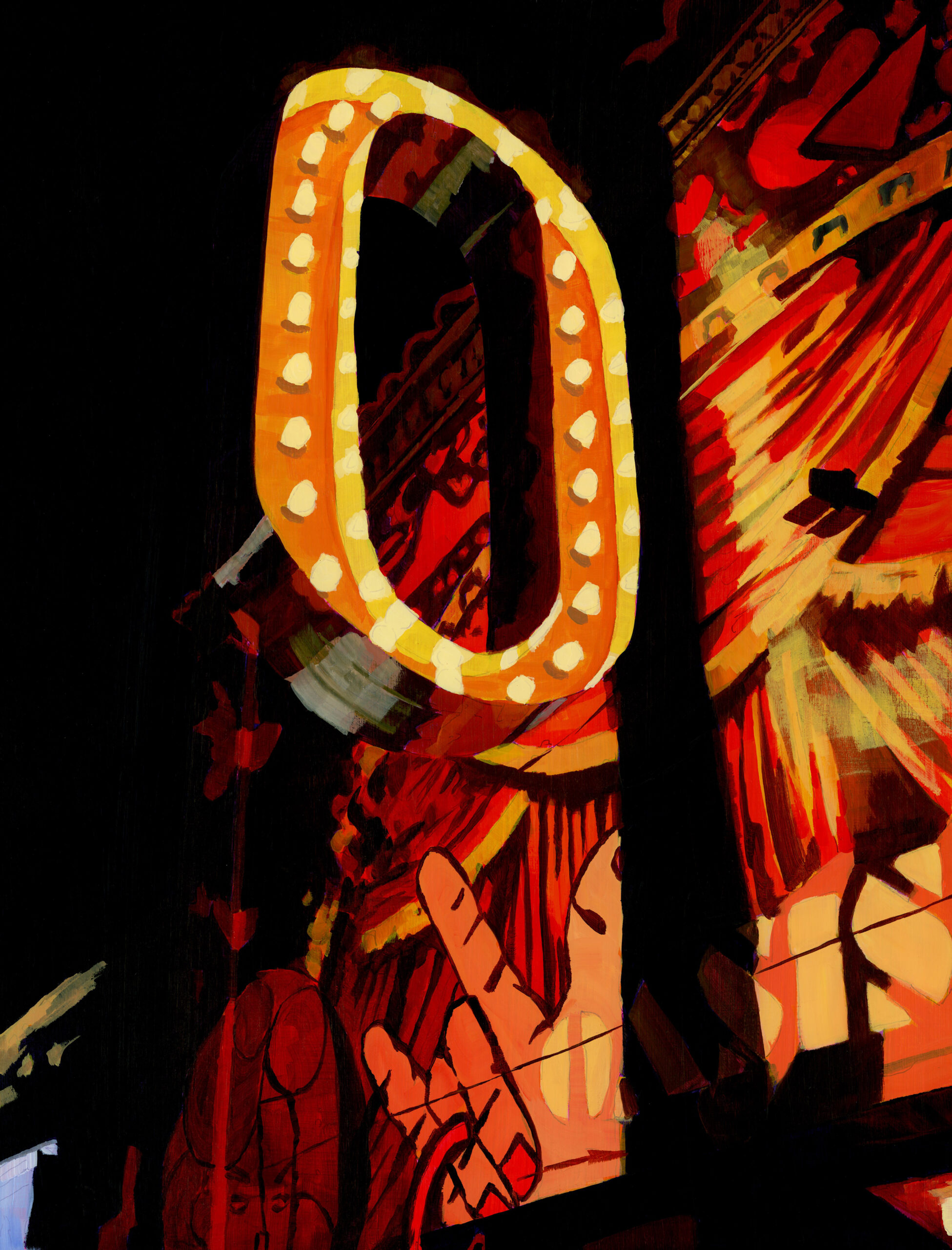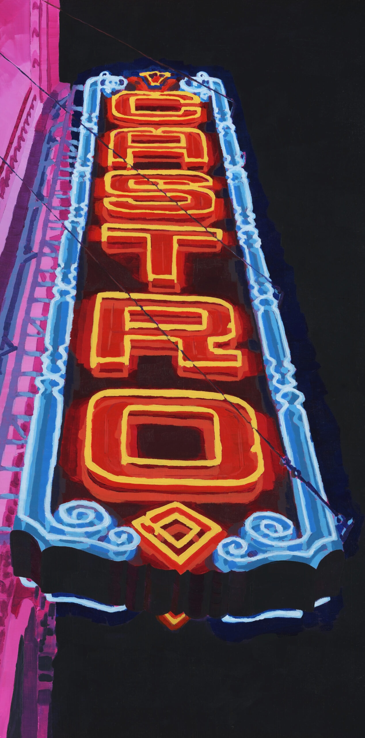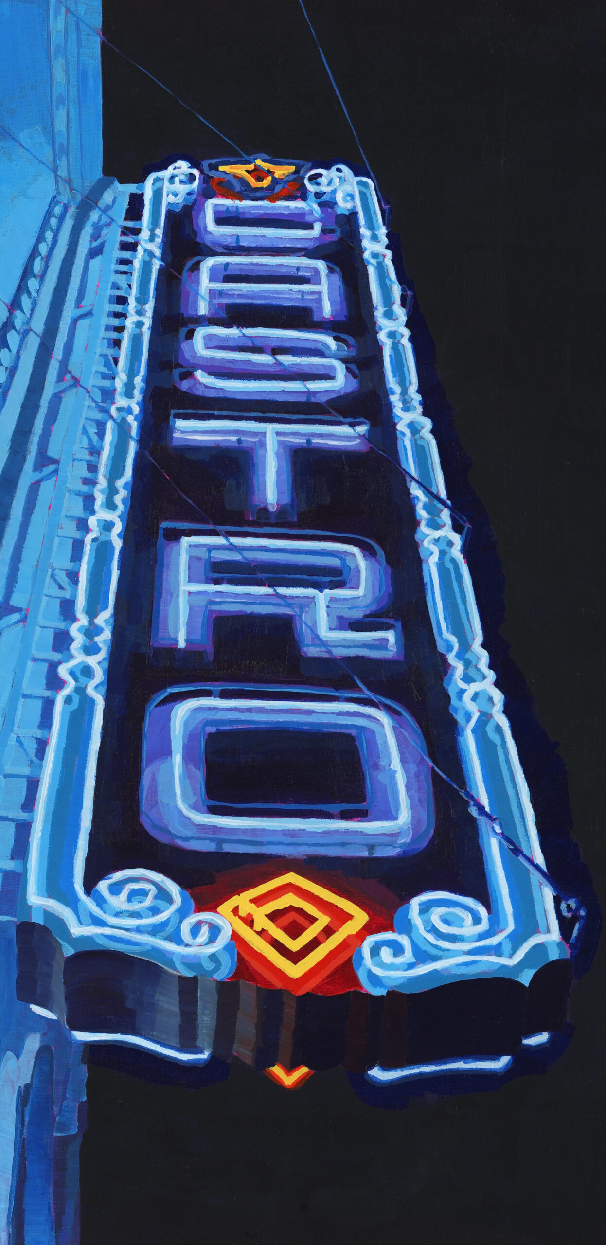 These paintings depict the Castro Theater’s neon blade sign at different stages in its cycle. The Castro Theater first opened in 1922, but the date of the blade sign and marquee neon is unknown since neon signs were not yet popular or widely available when the theater first opened.