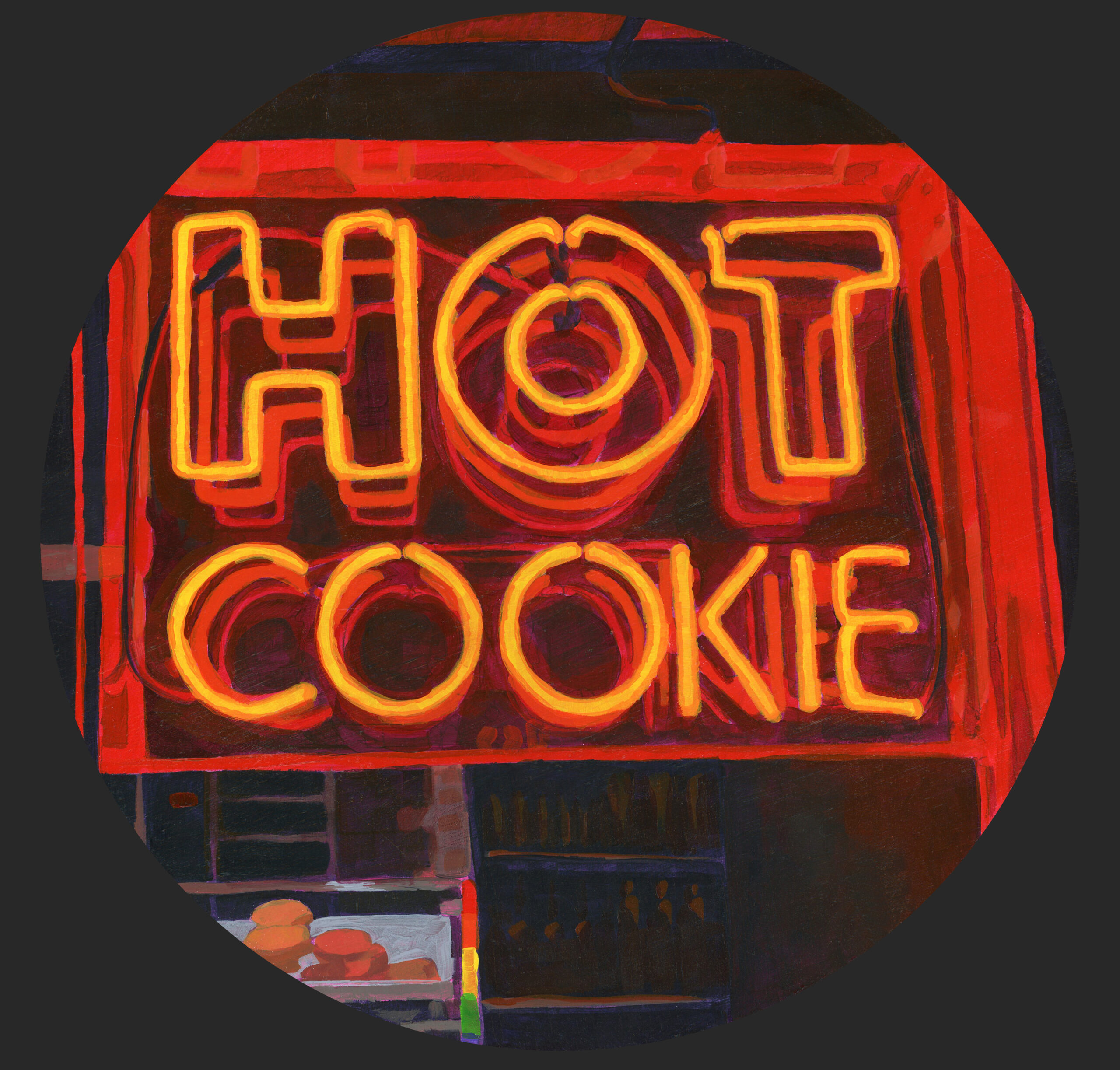 Hot Cookie Neon, acrylic on circular panel, 14″