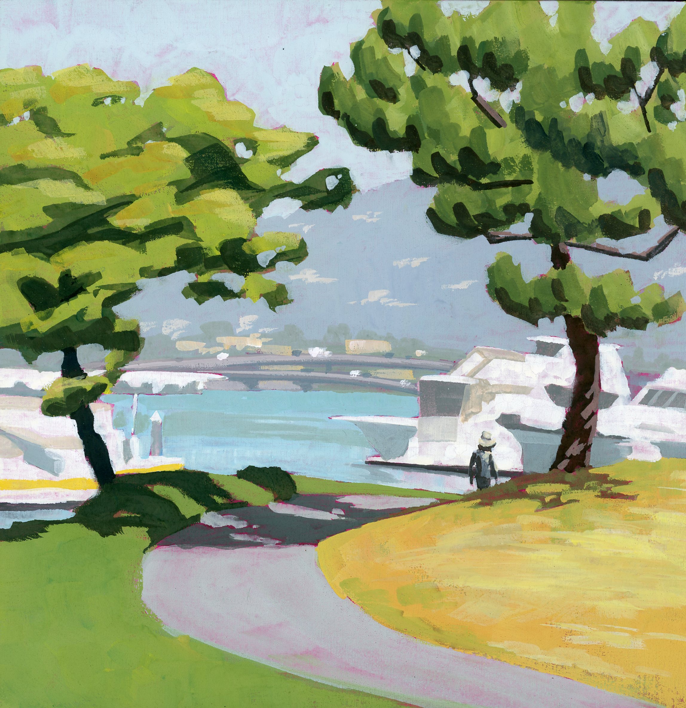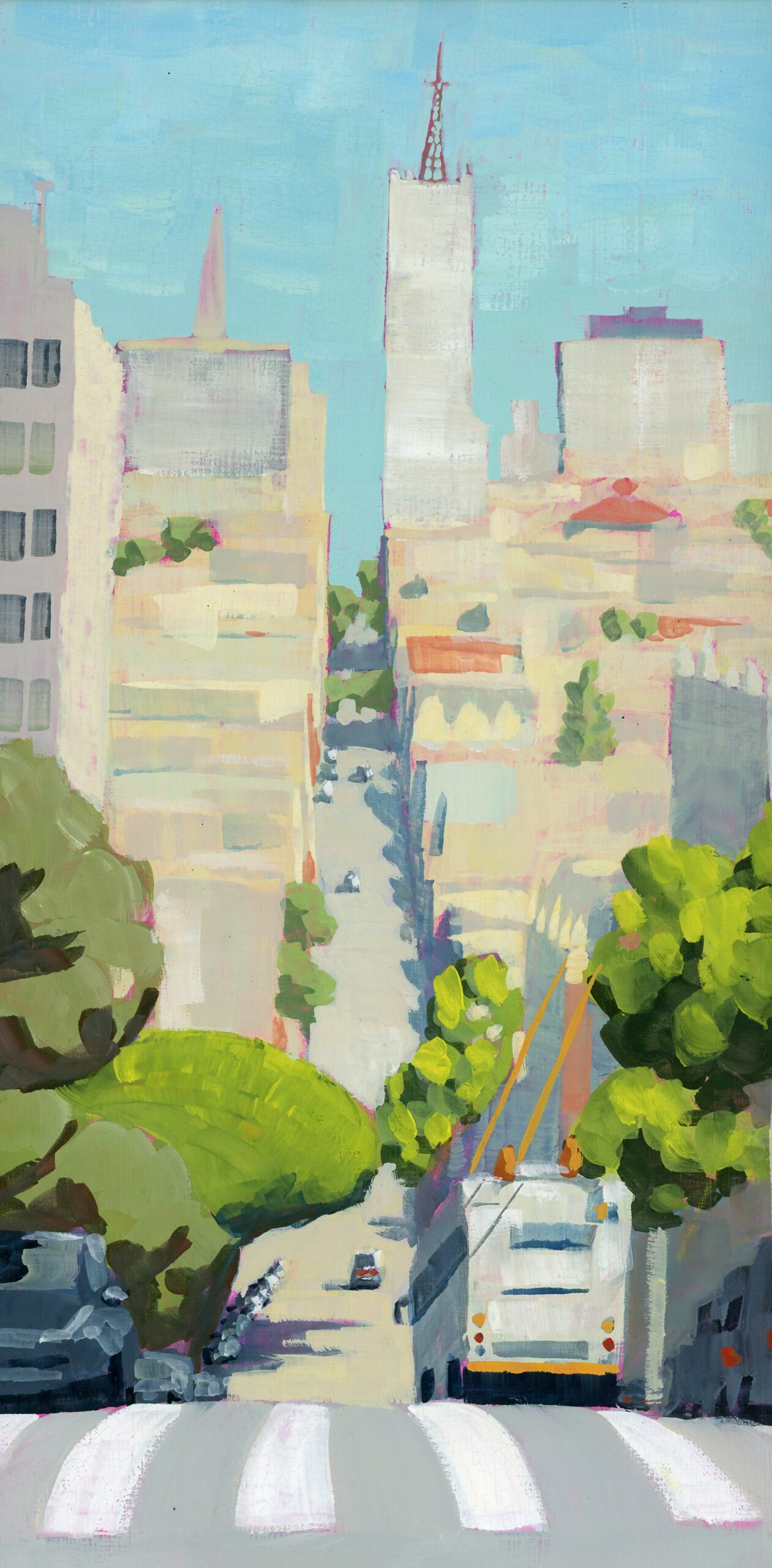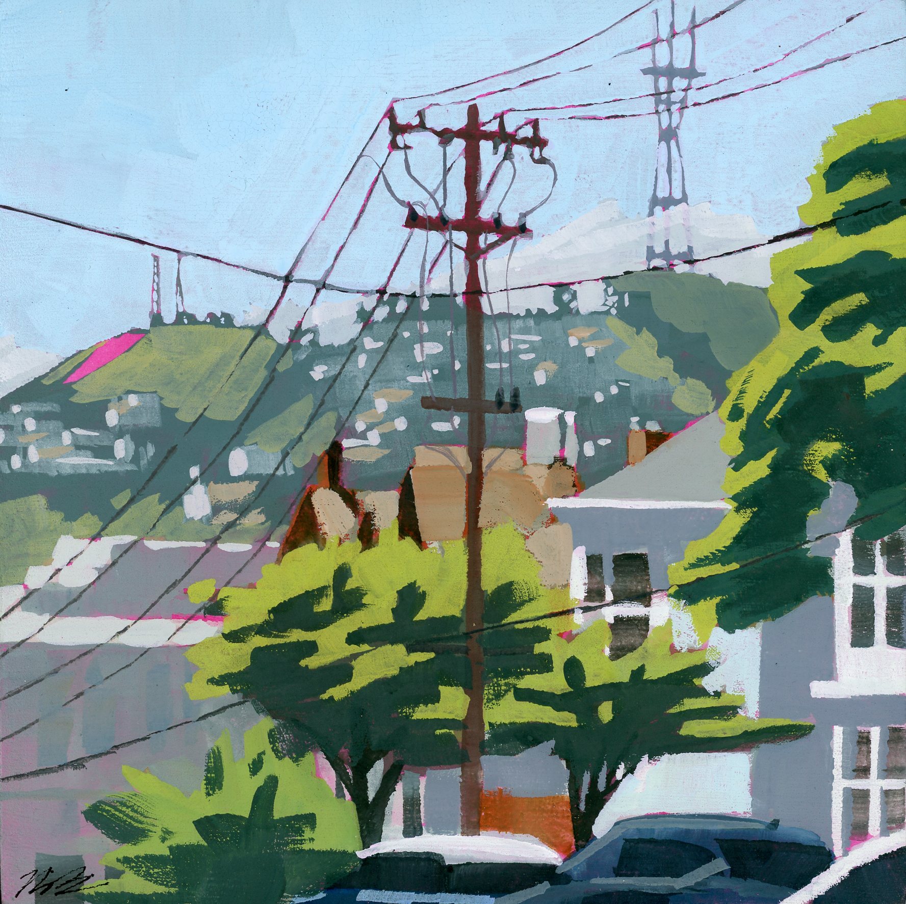 My paintings explore and celebrate the natural and built environments of the San Francisco Bay Area through simplification, light, and atmosphere. Most are painted en Plein Air with gouache. The first set of paintings are available, I also accept commissions for locations around the Bay Area.